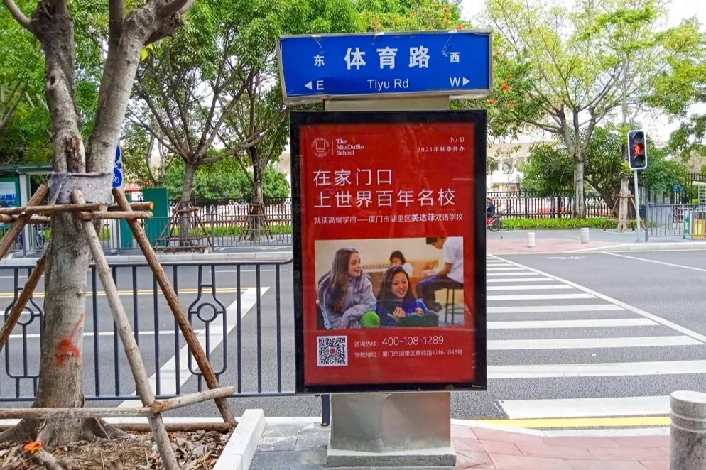 美達菲在廈門確定扎根后,重視線上線下的一系列宣傳告知,年后即開始在廈門戶外多個渠道進行大范圍的宣傳推廣,以“在家門口,上世界百年名校”為口號,集中在五緣灣、觀音山、會展、萬達廣場、蔡塘廣場等多個中高端商圈、商務(wù)圈,以及仙岳路、廈禾路、嘉禾路等多個主干道進行城市路名牌的投放,同時在島內(nèi)多個高端住宅小區(qū)的快遞柜進行大幅畫面展示。