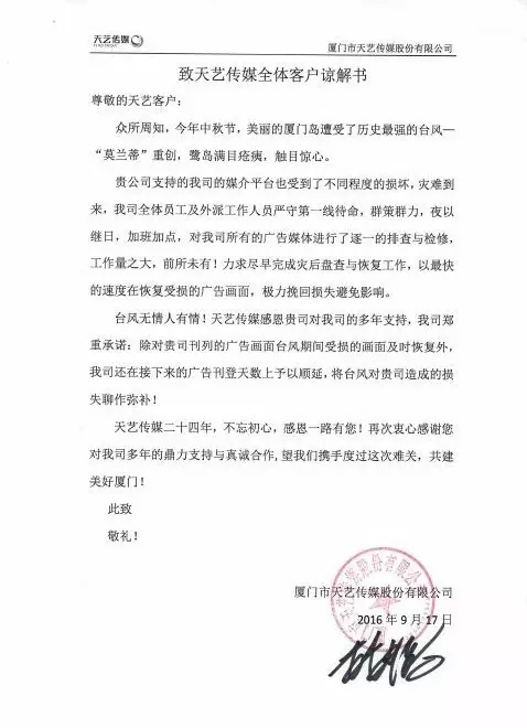 臺風無情人有情!天藝傳媒感恩貴司對我司的多年支持,我司鄭重承諾:除對貴司刊列的廣告畫面臺風期間受損的畫面及時恢復外,我司還在接下來的廣告刊登天數(shù)上予以順延,將臺風對貴司造成的損失聊作彌補!