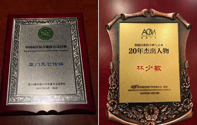 在剛剛落幕的第14屆中國戶外傳播大會上,廈門市天藝傳媒股份有限公司憑借20余年的媒體經(jīng)營實力、誠信可靠的行業(yè)口碑及強(qiáng)大的市場占有率,在第六屆中國百強(qiáng)媒體評選中,從眾多優(yōu)質(zhì)候選企業(yè)中脫穎而出,榮獲“中國市區(qū)綜合媒體公司20強(qiáng)”稱號。作為戶外廣告行業(yè)的標(biāo)桿人物,天藝傳媒董事長林少敏被授予“20年杰出人物”榮譽(yù)稱號!
